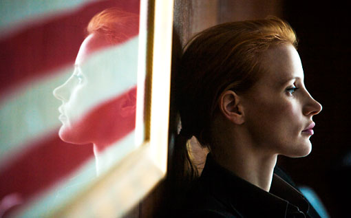 At the center of Bigelow’s film is one of filmdom’s greatest female characters of all time (all the more powerful for having been based on a real-life CIA analyst still working in the field), an agent named Maya played with calculated precision by Jessica Chastain (the doe-eyed red-head, all awkward coils that are both sinewy and frail, and with a soft voice that hides her steely demeanor beneath) who announces her talents to the world with this role much in the way that Cate Blanchett first staked her claim as the Queen in Elizabeth. Here we see Maya’s journey over ten years from wunderkind analyst to ruthless field operative. She takes awhile to find her voice, fumbling nervously through early enhanced interrogations, but once she finds that voice, she gives hell to anyone who stands in her way. Her goal is unshakable, and her commitment is in full. She is unforgiven. Unforgiving. And if she has to raise her voice, as she does to her station chief in Pakistan in the later portion of the film, you will hear her.
