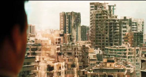 There’s a great scene in Brad Anderson’s latest film, Beirut, where a former party-diplomat turned washed-up labor contract negotiator Mason Skiles (a frazzled-yet-still-dapper-perfect Jon Hamm) settles into his Beirut highrise hotel after returning to the city for the first time in a decade and after finding it a hostile, gunshots-outside-of-the-airport-and-checkpoint-riddled mess, pours himself a drink and walks to the window to take in the bitter, shattered view of a stooping, bombed-out skyline.  Anderson’s camera then shifts POV’s to that of the bombed out skyline as it pans out and we see Mason staring out his window, the hotel itself one of those battered buildings, a shell-hole and tentacled crack blighting its side just a few windows away from Mason’s own.